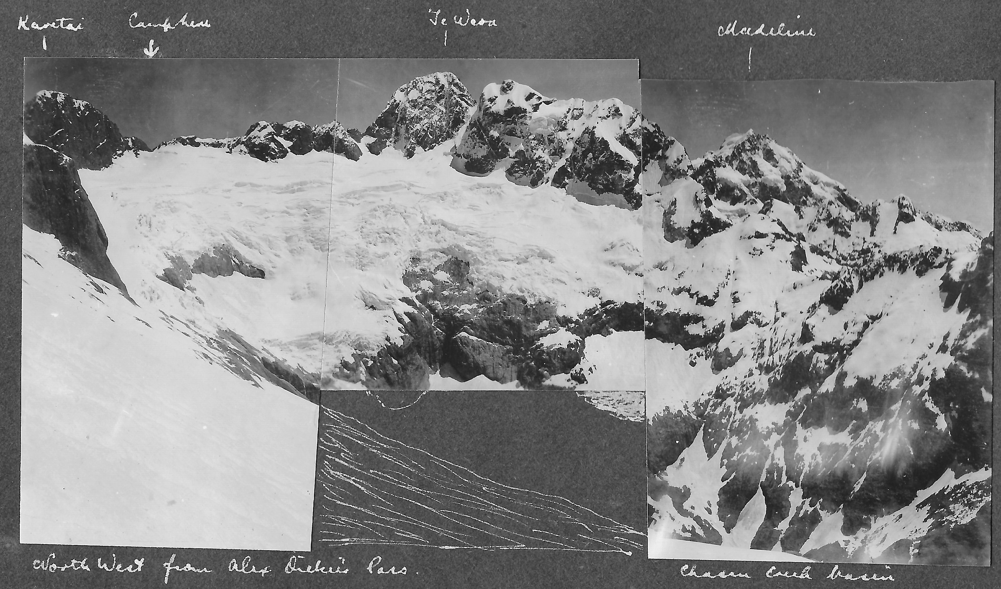 A magnificent and most impressive view greeted us. In front was Te Wera outstanding, with beneath it the large expanse of Te Puoho Glacier.