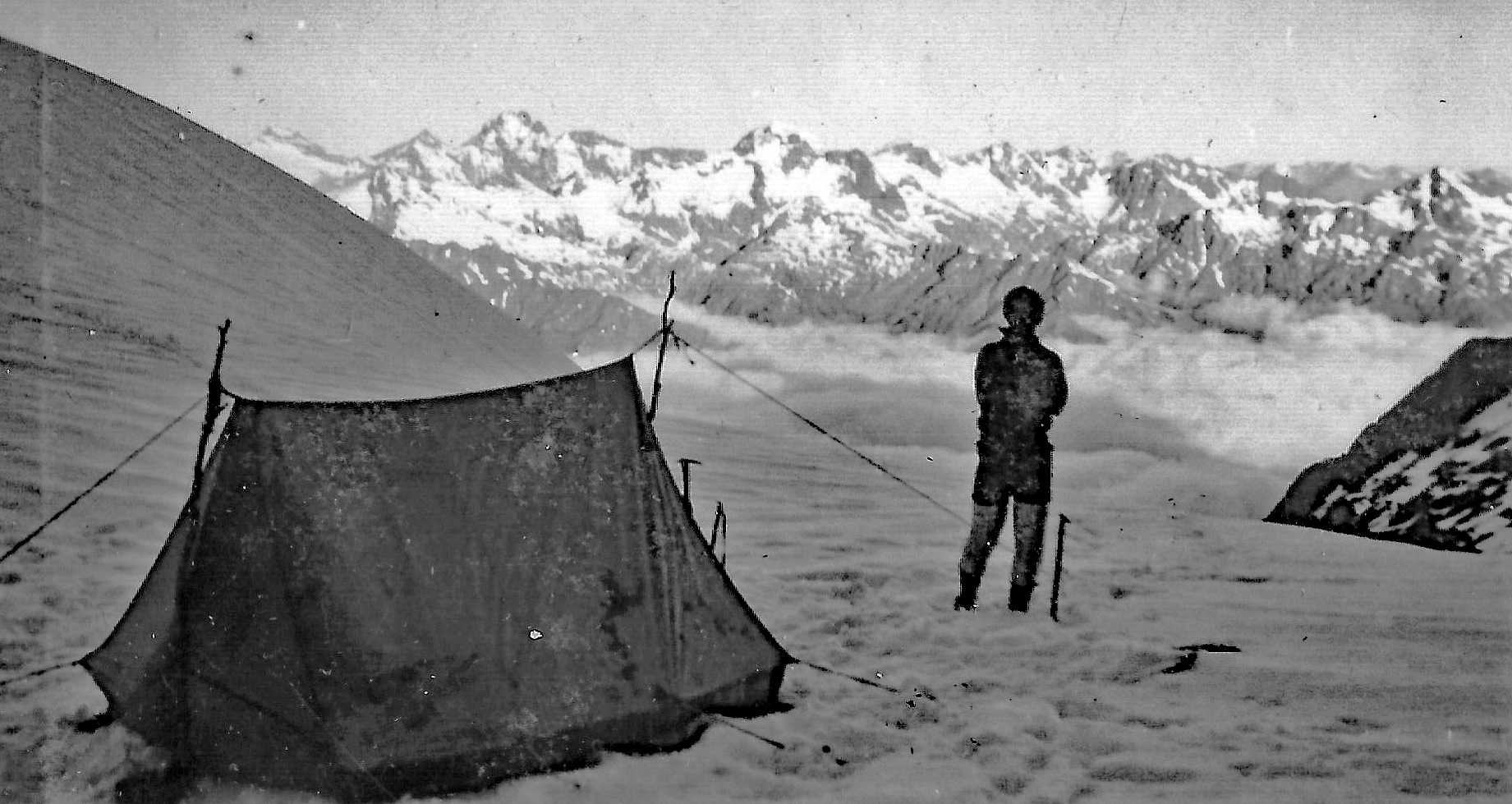 Near the top of the ledges, it began to rain a little so we hurried on and reached camp at 4:30pm, after one of our best days – not as regards weather but as regards climbing. She was the toughest peak I have ever climbed, and I’m feeling pretty proud of it all. I couldn’t have got anywhere without Dave, he is great as a climbing companion. Jack is a jolly good companion also but is apt to be dicky if there is any danger threatening – seems to be a complex with him, as he was great coming up the ledge when he couldn’t see the drop beneath while looking up all the time.