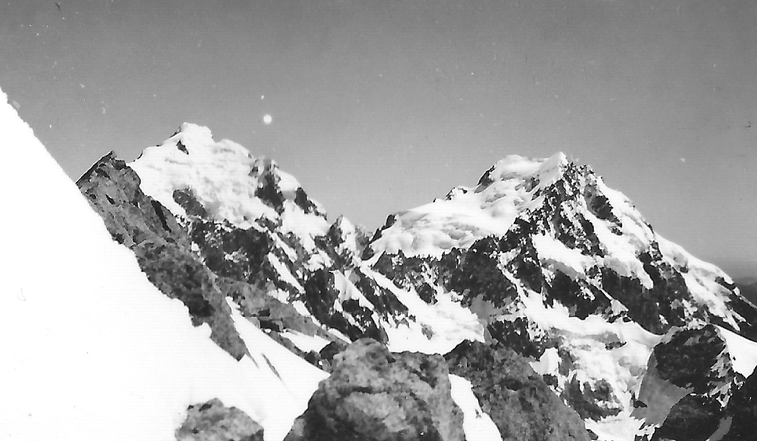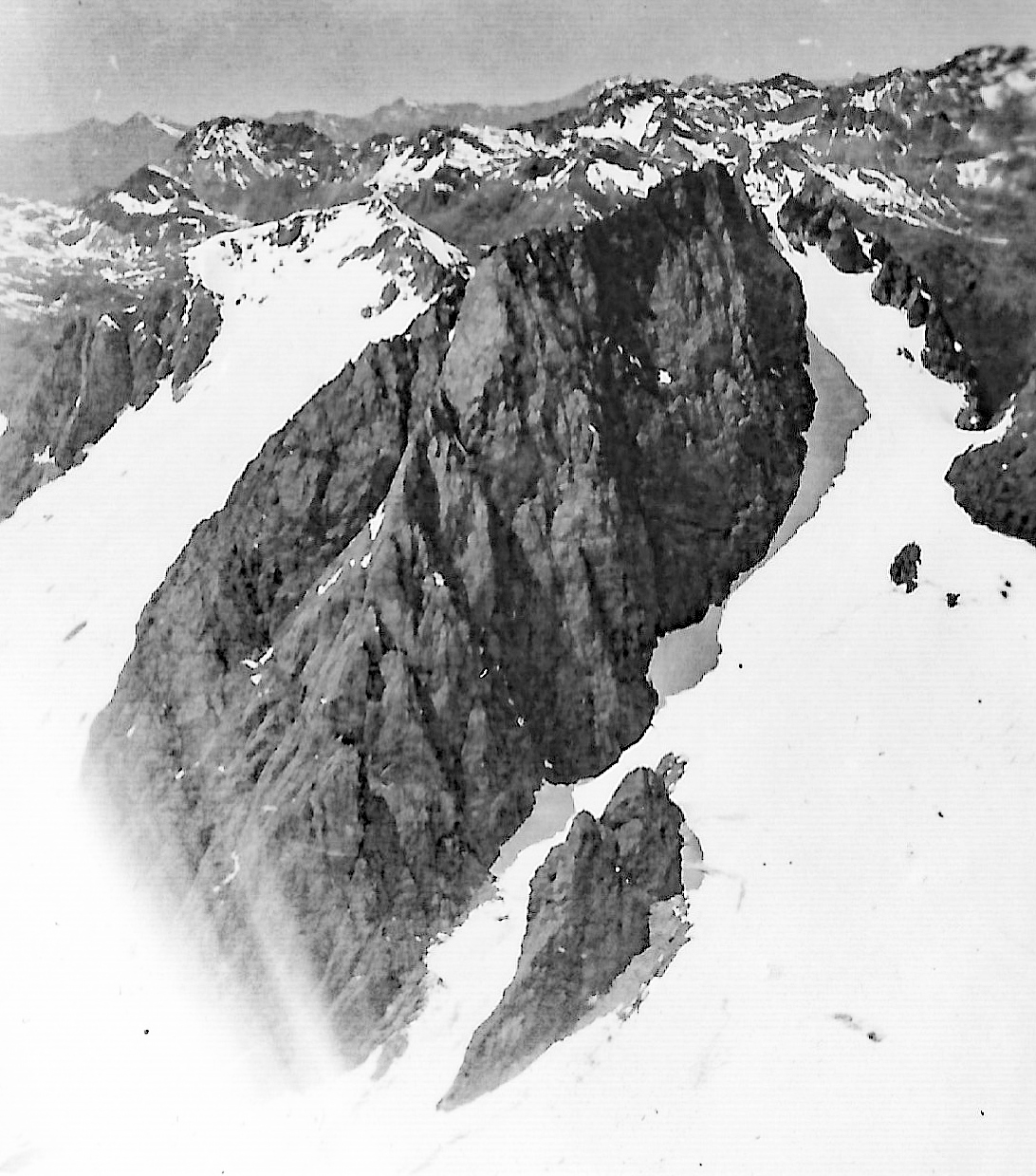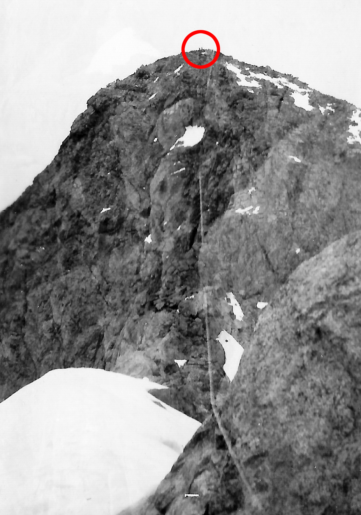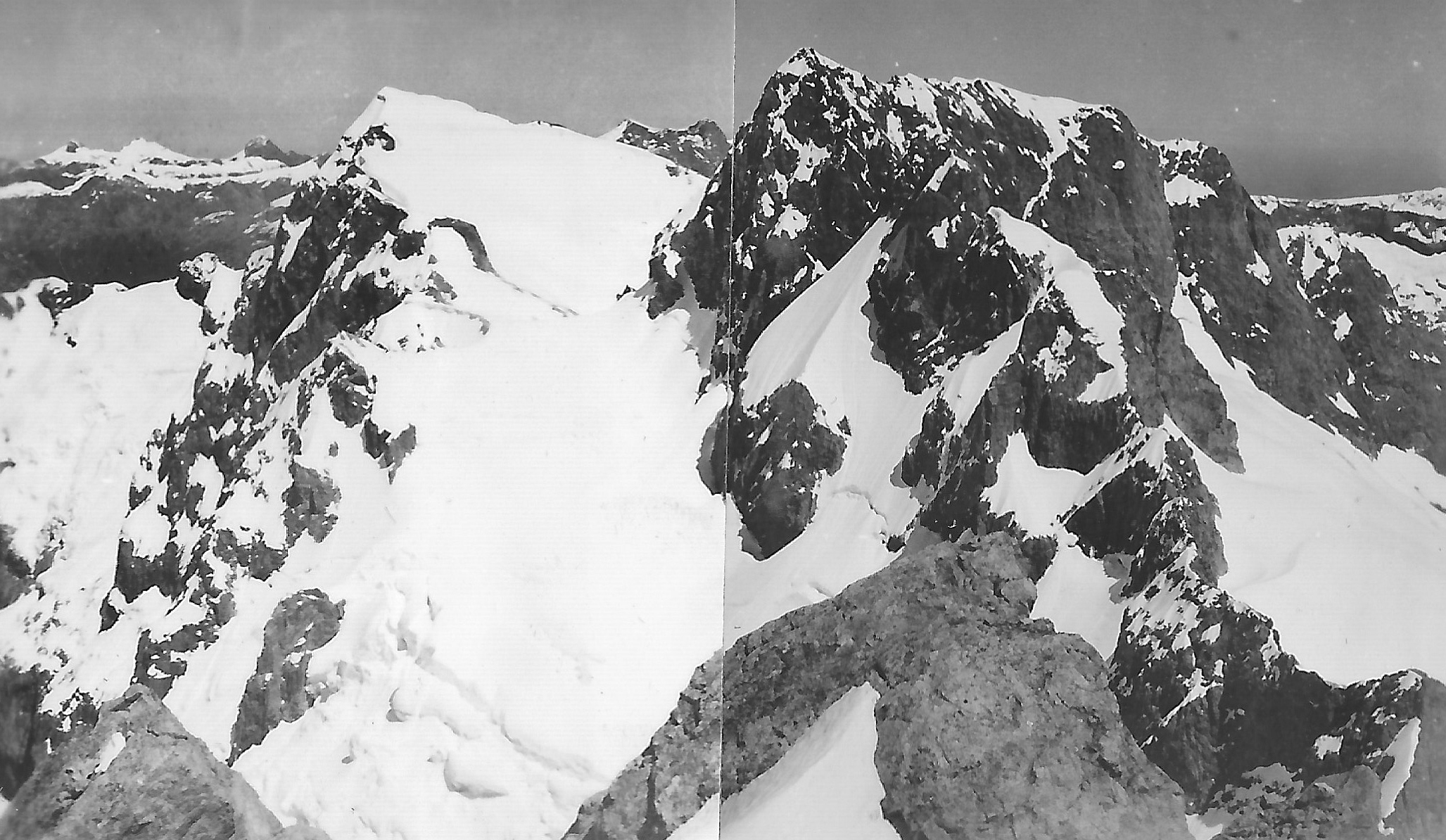 However after climbing round several gendarmes which were encircled by steep moats in the snow some 30 feet deep, we finally made up the last steep snow slope
