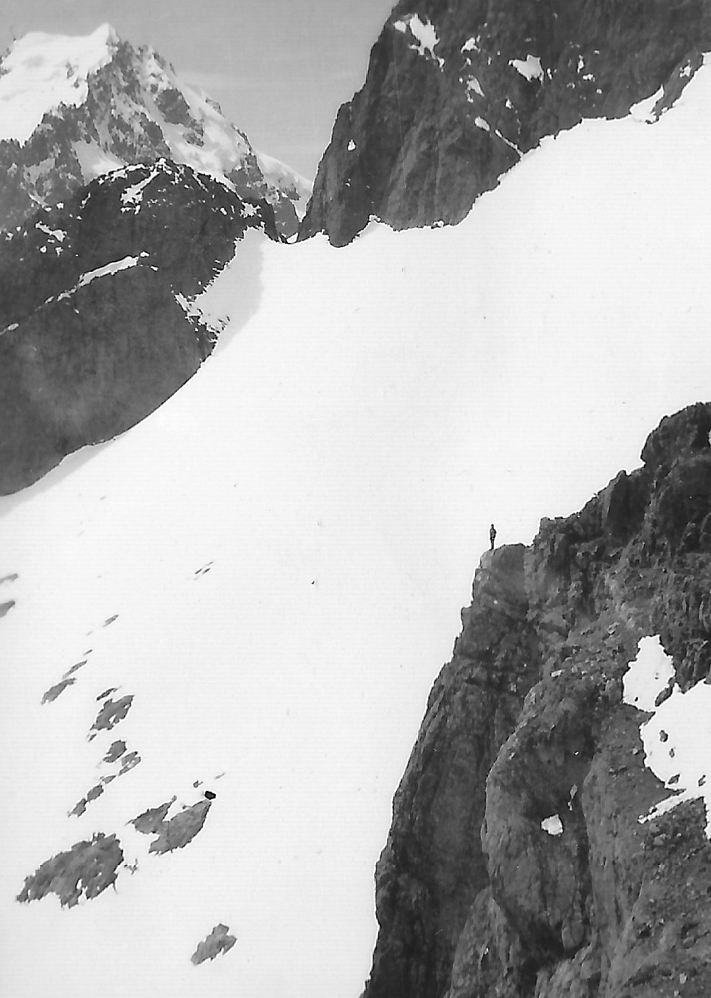 We zigzagged up the snow which became increasingly steep, and was dangerously soft, worked round beneath the rock wall on our left, crossed two crevasses, then up more steep snow, round the corner, up a bit more, then managed to work up on to a bit of rock and edged round the corner by this ledge, then out on to the pass.