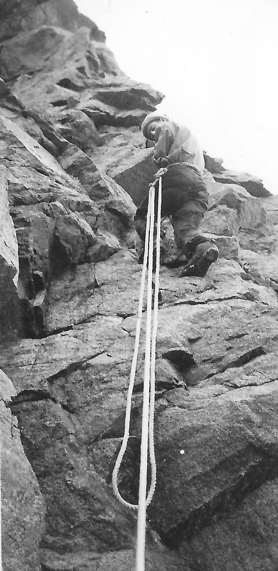 Then with a great effort, I jumped the rock above me and swung my body over the overhang, only to find that I was clinging to a face dropping sheer into the cirque 2000’ below, a great precipice and one of the best I’ve seen. The rock I had worked on to was slightly sloping, luckily for me, but appeared to be devoid of holds. At the bottom I could stretch out both arms and just grasp two rocky edges, but these receded from each other above, so there was nothing for it but friction holds. My finger nails did surprisingly good work. My knees kept slipping but I went up so fast that each knee was on the rock above before the lower one had had time to slip very far. So that it was some relief to grasp a solid hold at the top. This was the most dangerous of any rock climbing I have ever done and I was lucky to pull it off.