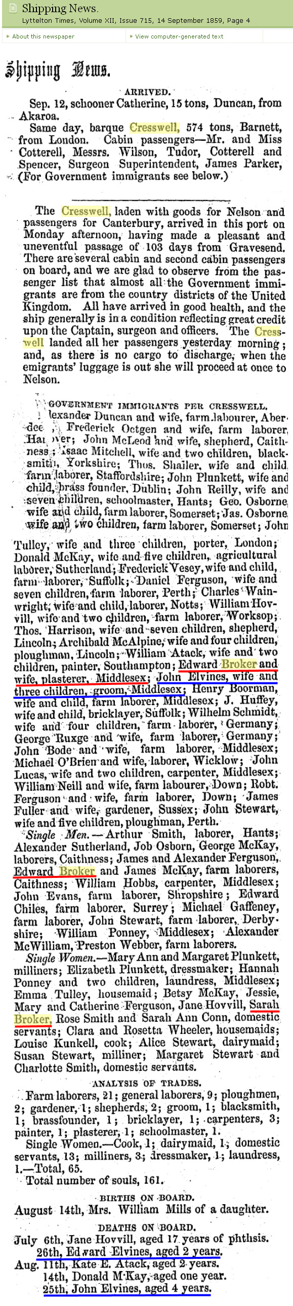 Assisted Emigration to CANTERBURY by the Ship CRESSWELL
