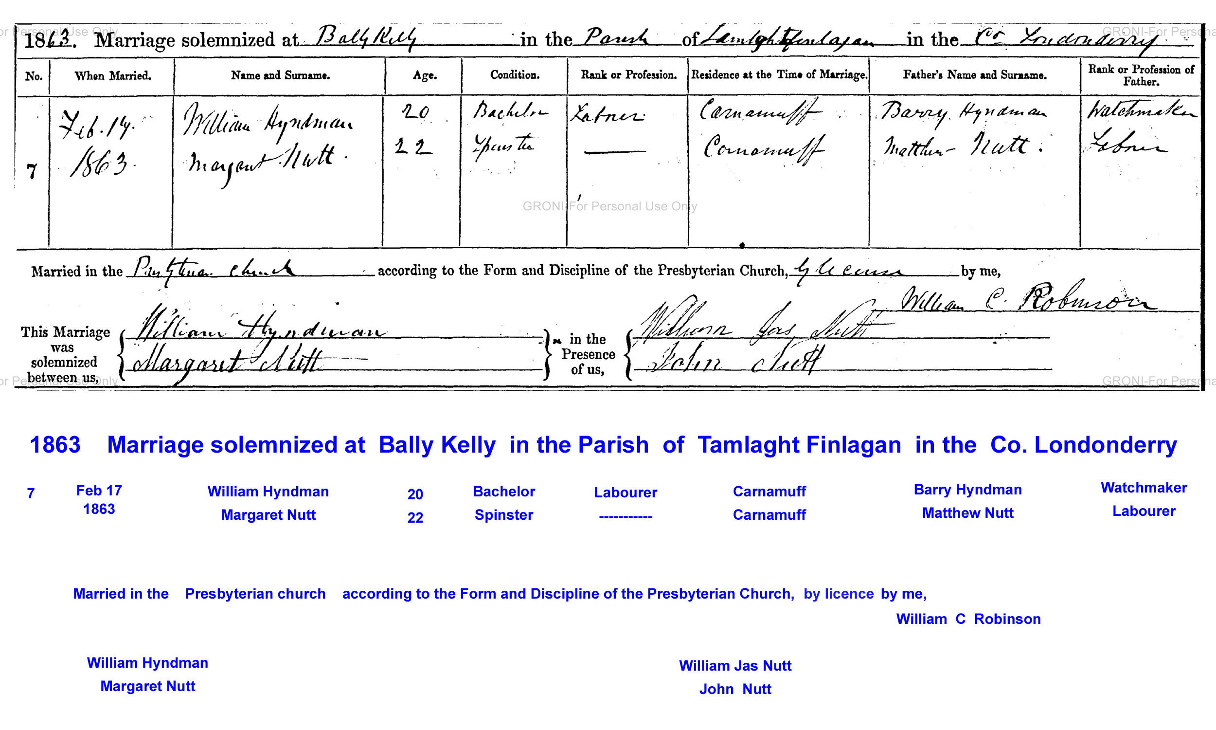 17 February 1863 - Bally Kelly, County Londonderry, Northern Ireland