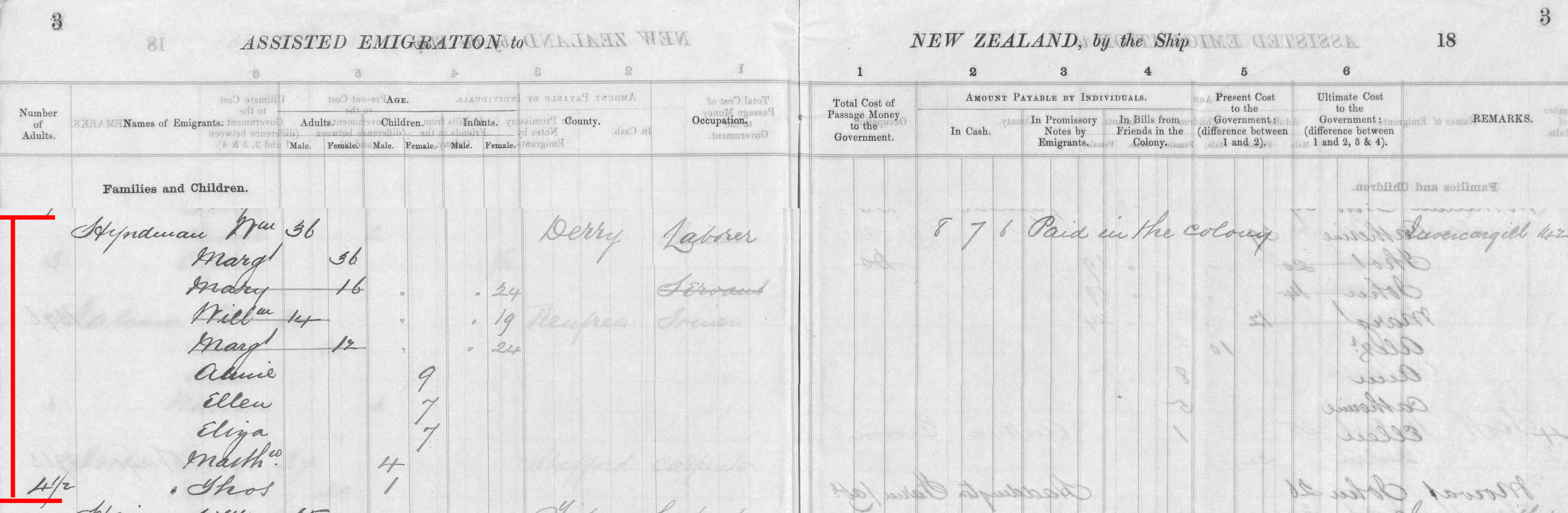 | HYNDMAN | William | 36 | Husband | Derry | Laborer | £8 7s 6d | Paid in the colony | ||