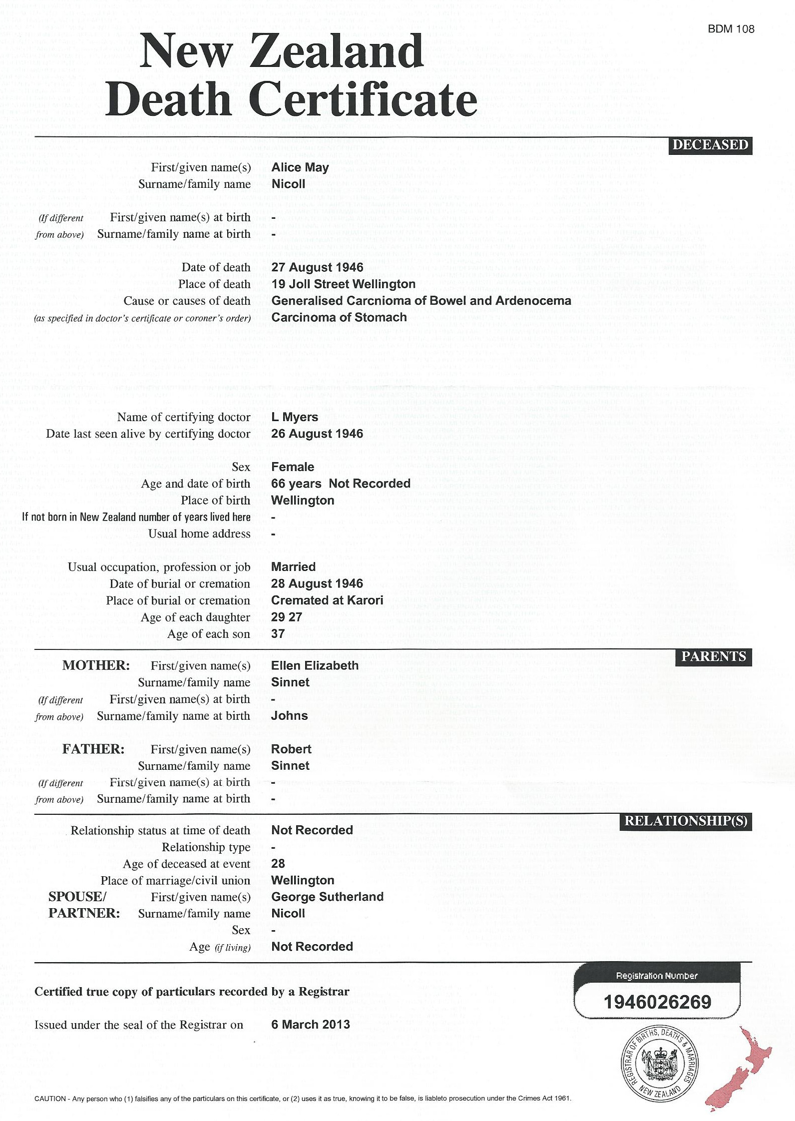 Died: 27 August 1946 - Wellington, NZ (cert)