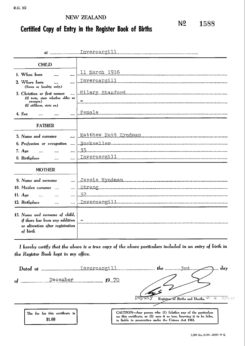 Born: 11 March 1916 - Invercargill, NZ
