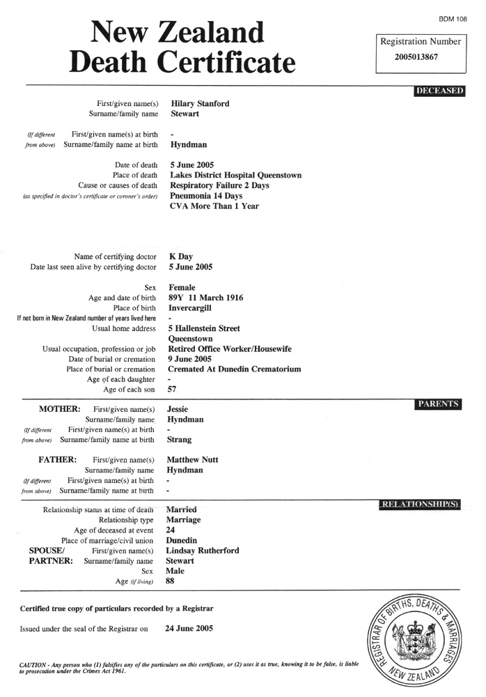 Died: 5 June 2005 - Queenstown, NZ