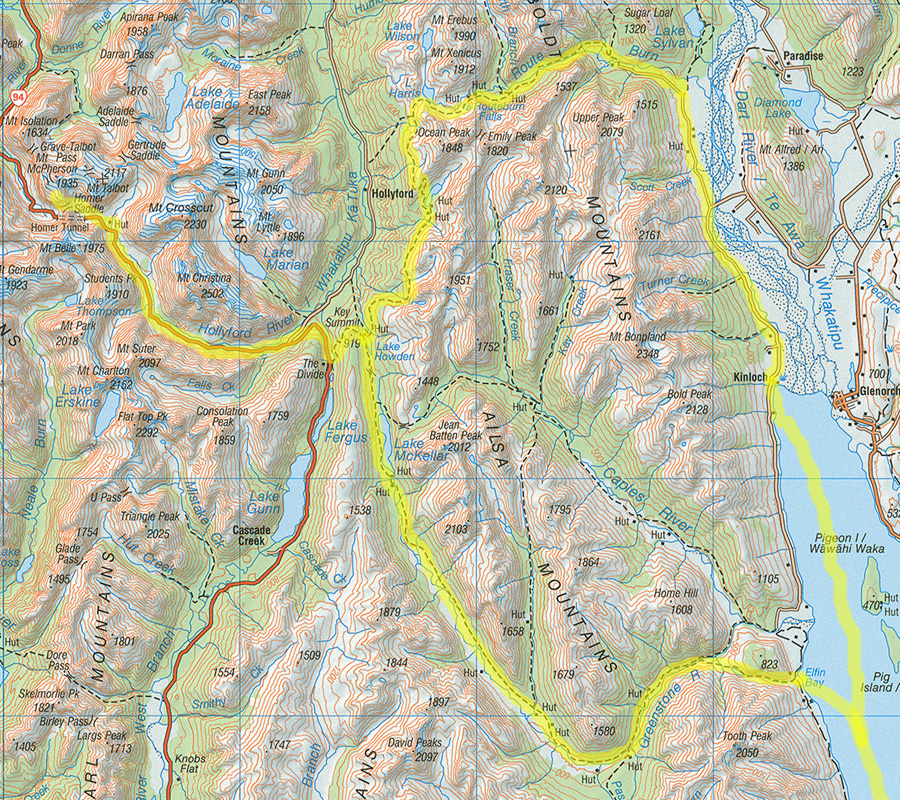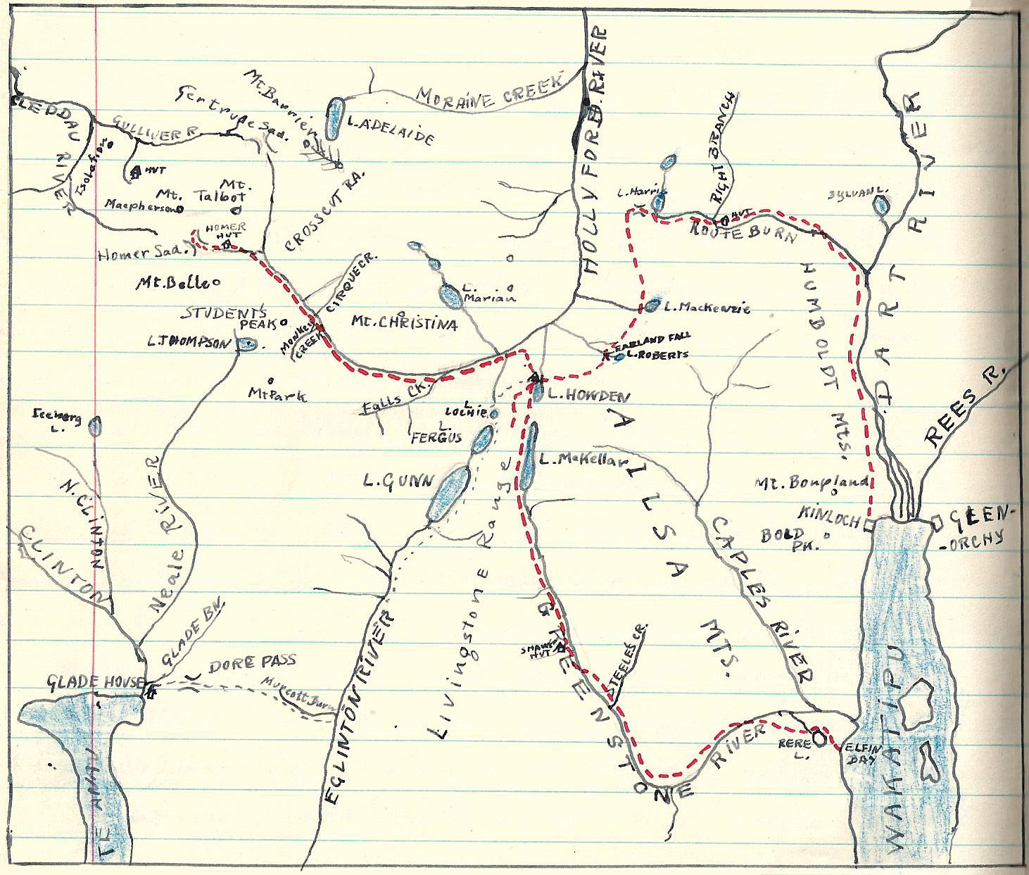 Misty in the morning but it soon cleared away. We set off early for Routeburn. ¾ hour sufficed to bring us to the Earland Falls, which come over a rock precipice from a lake – Lake Roberts. The track from here through the bush was pretty rough, but we arrived at Lake McKenzie in time for dinner. Then we took the blazed trail up through the bush and up the zigzag on to the track round Ocean Peak. It was a great day, and the mountains on the other side of the Lower Hollyford Valley were simply wonderful – Mts Christina, Tutoko, and Madeleine all snow covered. To the north, away in the distance, we could see Lake McKerrow. After we had gone round the slopes of Ocean Peak, a stiff but mercifully short climb brought us on the Lake Harris Saddle, and below us lay Lake Harris, a fine example of a deep mountain lake. After some more climbing up round to the right of the lake, the while Routeburn Valley lay spread below us. It was a fine sight. From then on the track went down and down, soon entering the bush, and in an hour after entering this we reached the Routeburn Huts. Above the fireplace in one of the huts is Dad’s name, dated 4-5-11. He was there then.