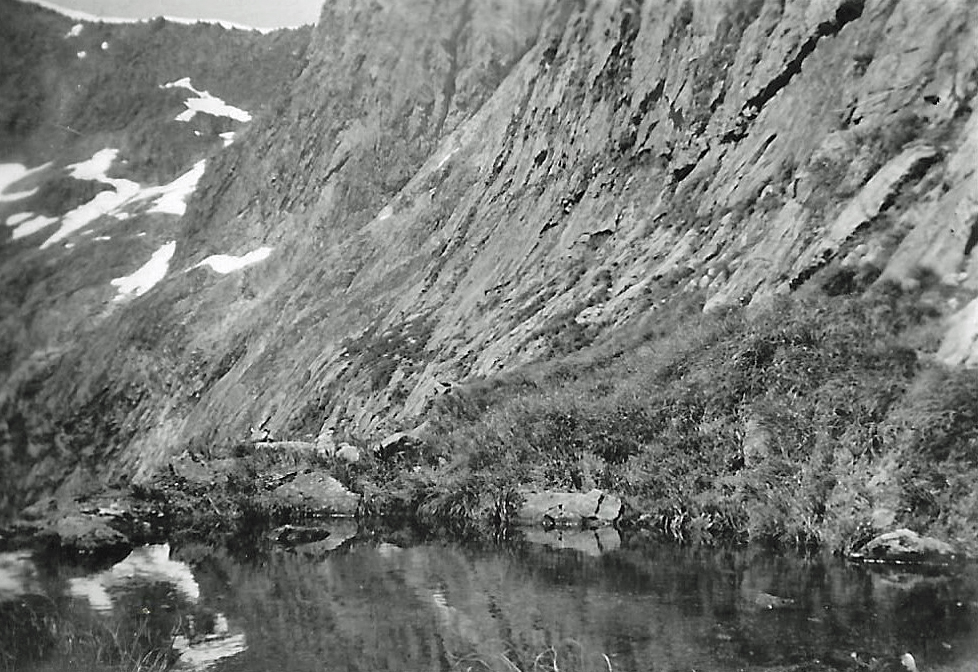 Lindsay and I left for the Gertrude over the scree slopes at the foot of Mt Talbot at 6:15 am. Black Lake was reached at 7:45 am, and Gertrude Saddle at 8:30 am, after crossing a large patch of snow. There was a great view from the saddle down towards Milford. We made up the ridge on the right, at first on rock, and then up a huge snowfield, the biggest I have yet seen.
