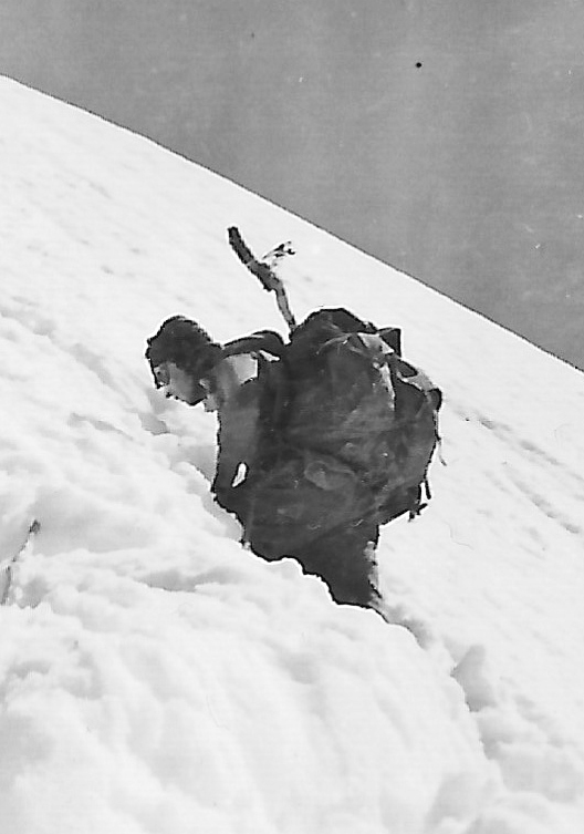 Near the top after an exhausting climb, I fell into a snow-filled crevasse and the jolly pack prevented me from getting out, so Jack had to come up and help.