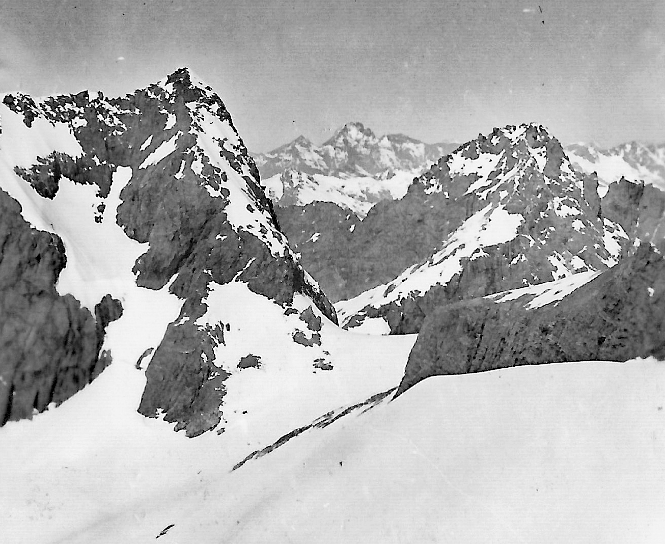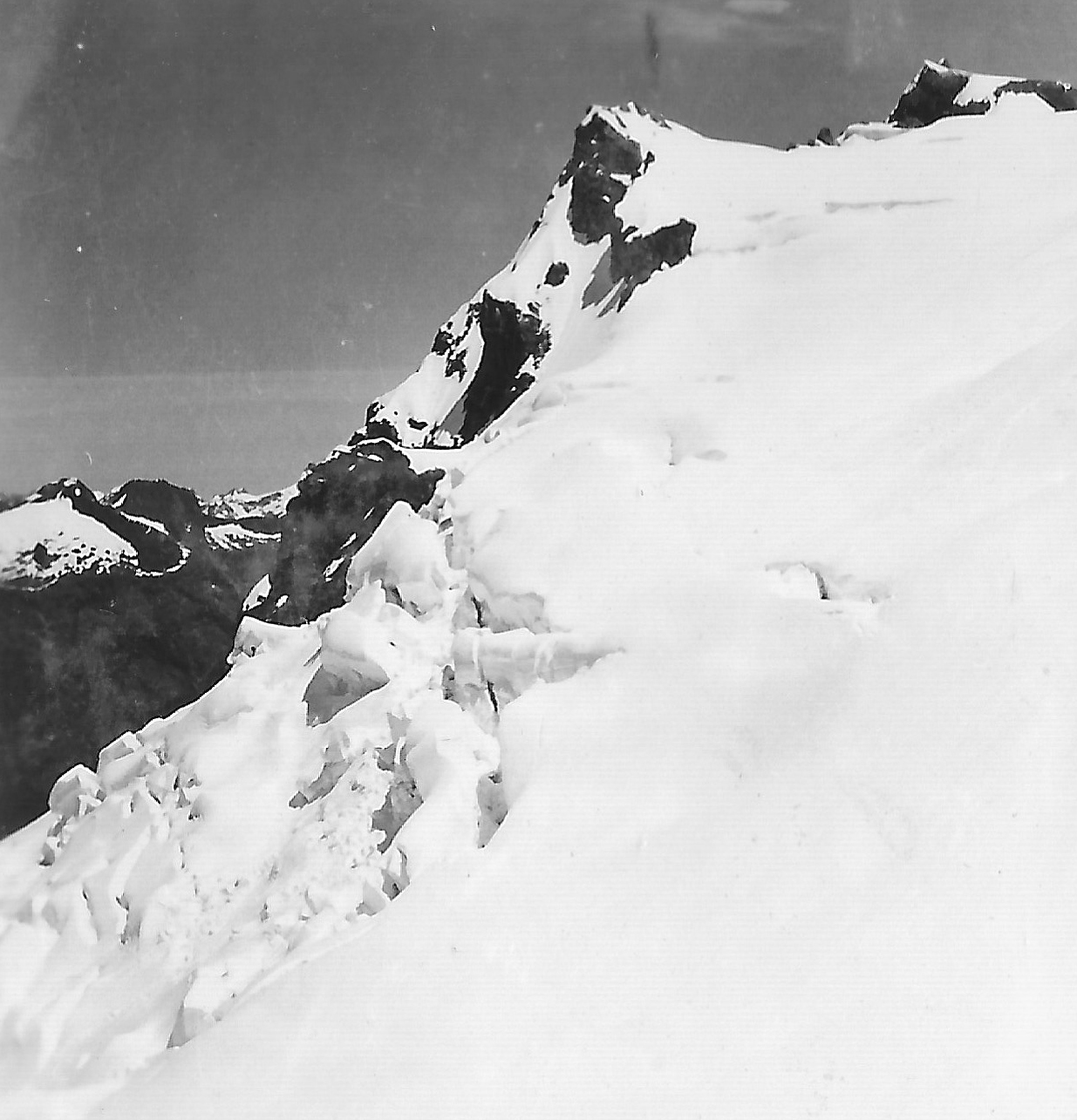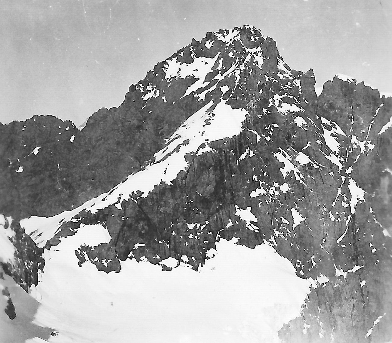 However after climbing round several gendarmes which were encircled by steep moats in the snow some 30 feet deep, we finally made up the last steep snow slope