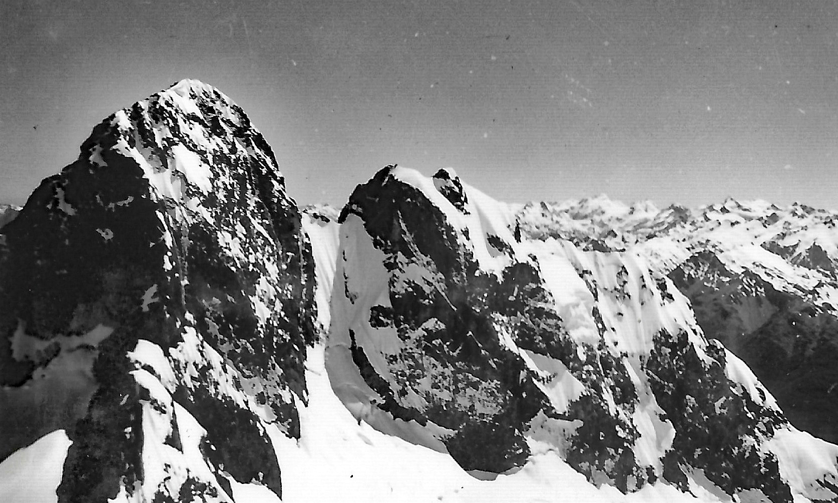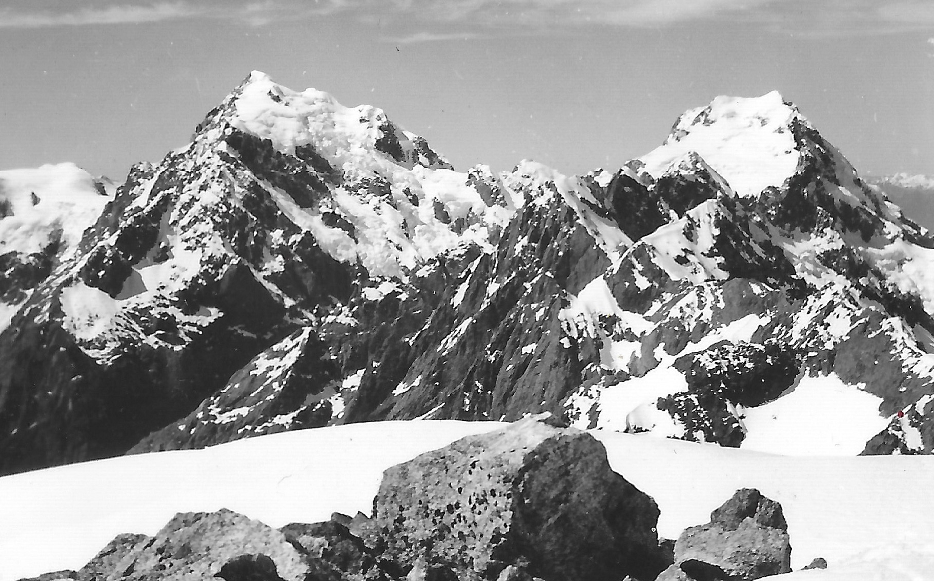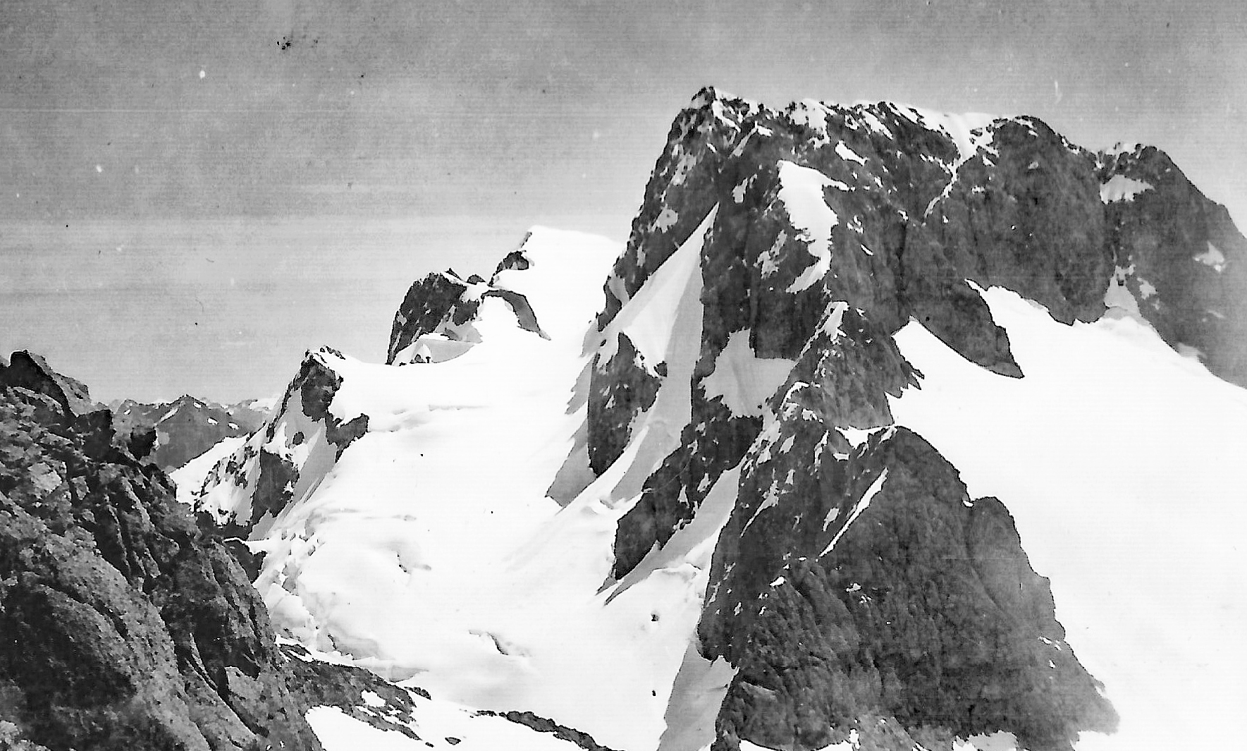 However after climbing round several gendarmes which were encircled by steep moats in the snow some 30 feet deep, we finally made up the last steep snow slope