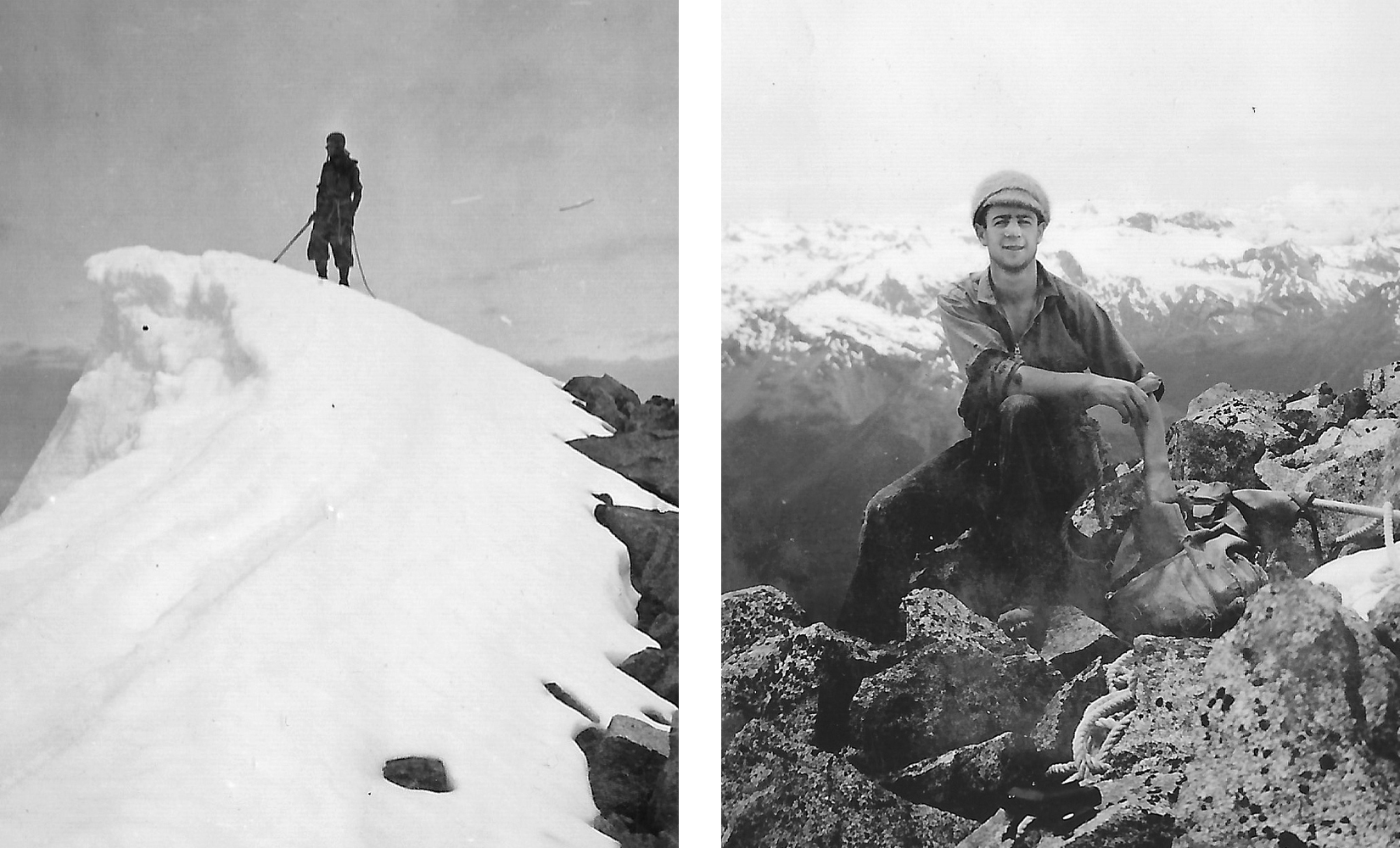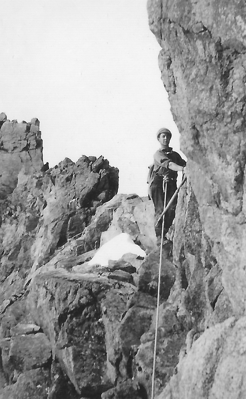 Hauled Dave up on the rope straight up a chimney, much easier both for him and me, as it saved much time. Incidentally had I slipped on that face, the rope must have broken, for Dave was a full 70 feet below and no rope would stand a 140 foot drop like that. However one does these things without worrying about them at the time.