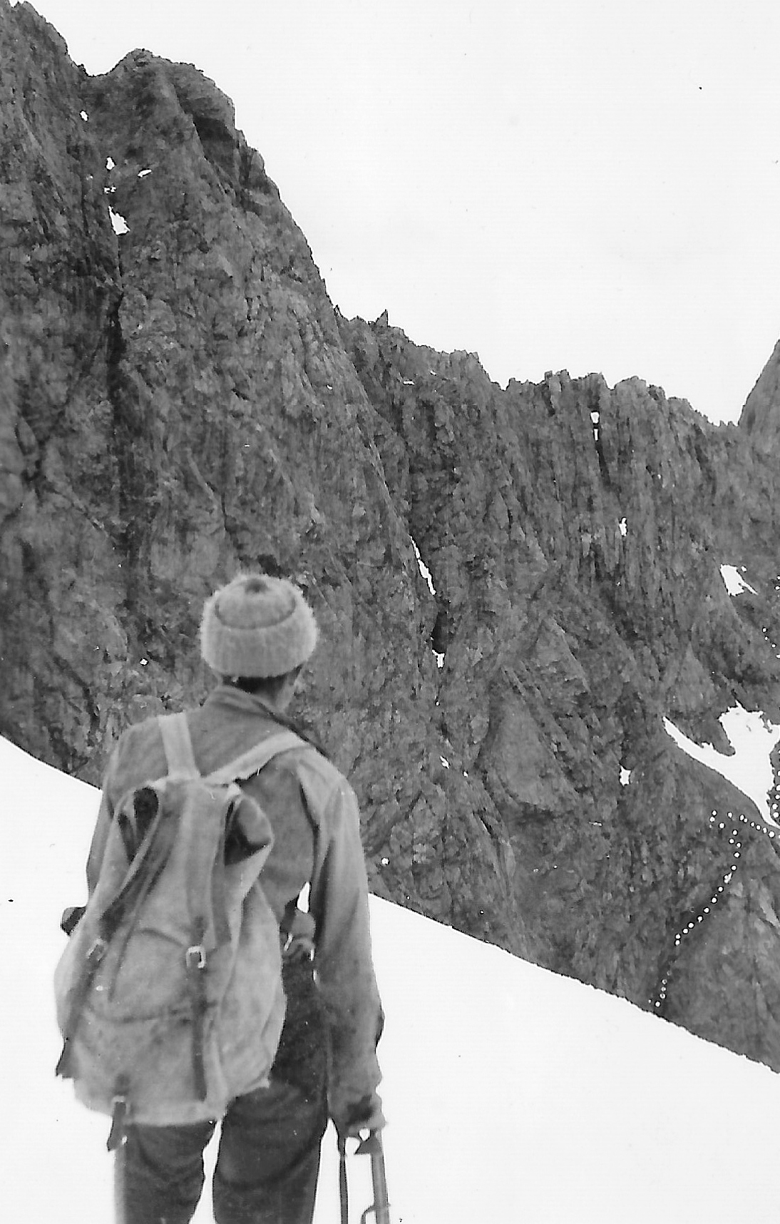 We now plugged across the southwest snowfield towards the ledges in the Rock Wall which Dave and I descended yesterday. These we soon reached and found the takeoff from the snow to be reasonably good. Soon after crossing several good series of ledges, snow grass ones overhanging several steep chimneys, we reached the place to which we had got yesterday, and after that all was plain sailing.