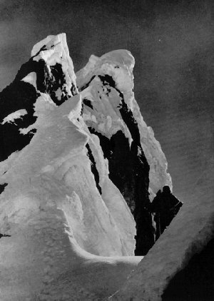 The deceptive ease with which they had reached the summit ridge led Ryan and Stewart to plan to take the summit by storm in one day from Camp I, a ridiculous underestimate of the difficulties of the ridge. They left at 5 a.m. next morning and by 7 a.m. were on the face. Here they received a nasty shock. On the steep ice-faces all the steps were filled with loose snow which had laboriously to be cleared, while the rock was coated in treacherous verglas. They were very much behind time when they turned up the steepest part of the face and it now snowed steadily and heavily. The snow poured down the steep rocks like water, making progress still slower; further, Stewart was soon exhausted by inadequate acclimatisation, so that the wild optimism of the early morning, which included a night out if necessary, was replaced by a heavy pessimism which truly forecast that they would not in fact reach any higher than previously. Once again they turned back down a face much more dangerous, so that meticulous and slow care barely took them to the névé by nightfall and another trudge across the snow in the dark.