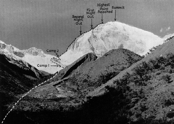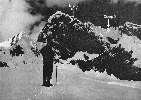 Davis and Ryan had spent a cold night at a temporary intermediate camp beneath the face and were soon joined by Crawford and Warburton, who had left Camp I at 5 a.m. Carrying heavy loads they all moved painfully slowly, particularly up the steeper slopes. The two down at Base, following their progress anxiously, became thoroughly alarmed as it became increasingly obvious that they would not reach Camp II site until very late. In actual fact Crawford and Warburton dumped their loads on the ice face beneath Camp II and returned carefully in the evening and night to Camp I, arriving at 11.30 p.m. after a most exhausting time. Davis and Ryan, successfully established Camp II in an ideal little snow hollow and settled down to a quite comfortable night, secure in the knowledge that the summit was now within the grasp of the party after their tremendous exertions that day.