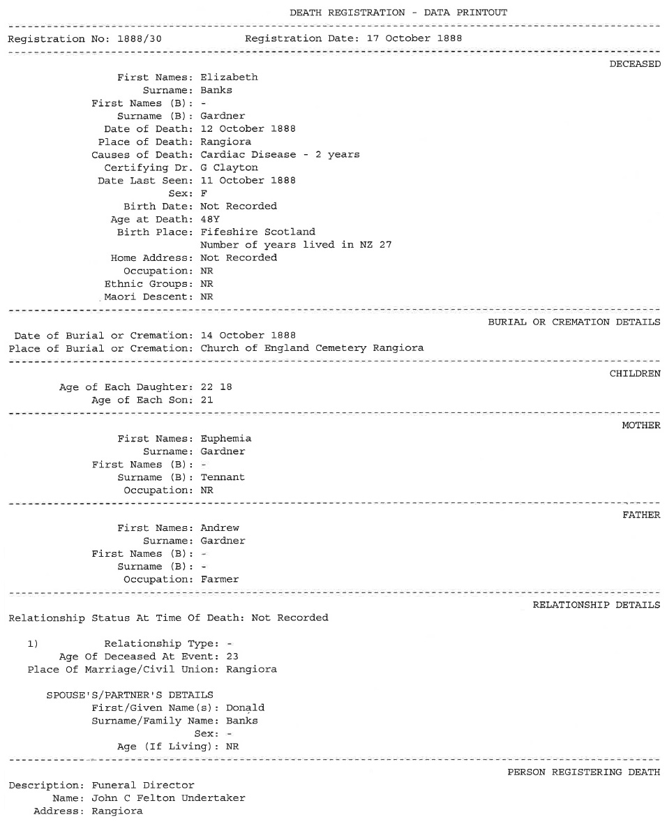 12 October 1888 - Rangiora, Canterbury, NZ (cert printout)