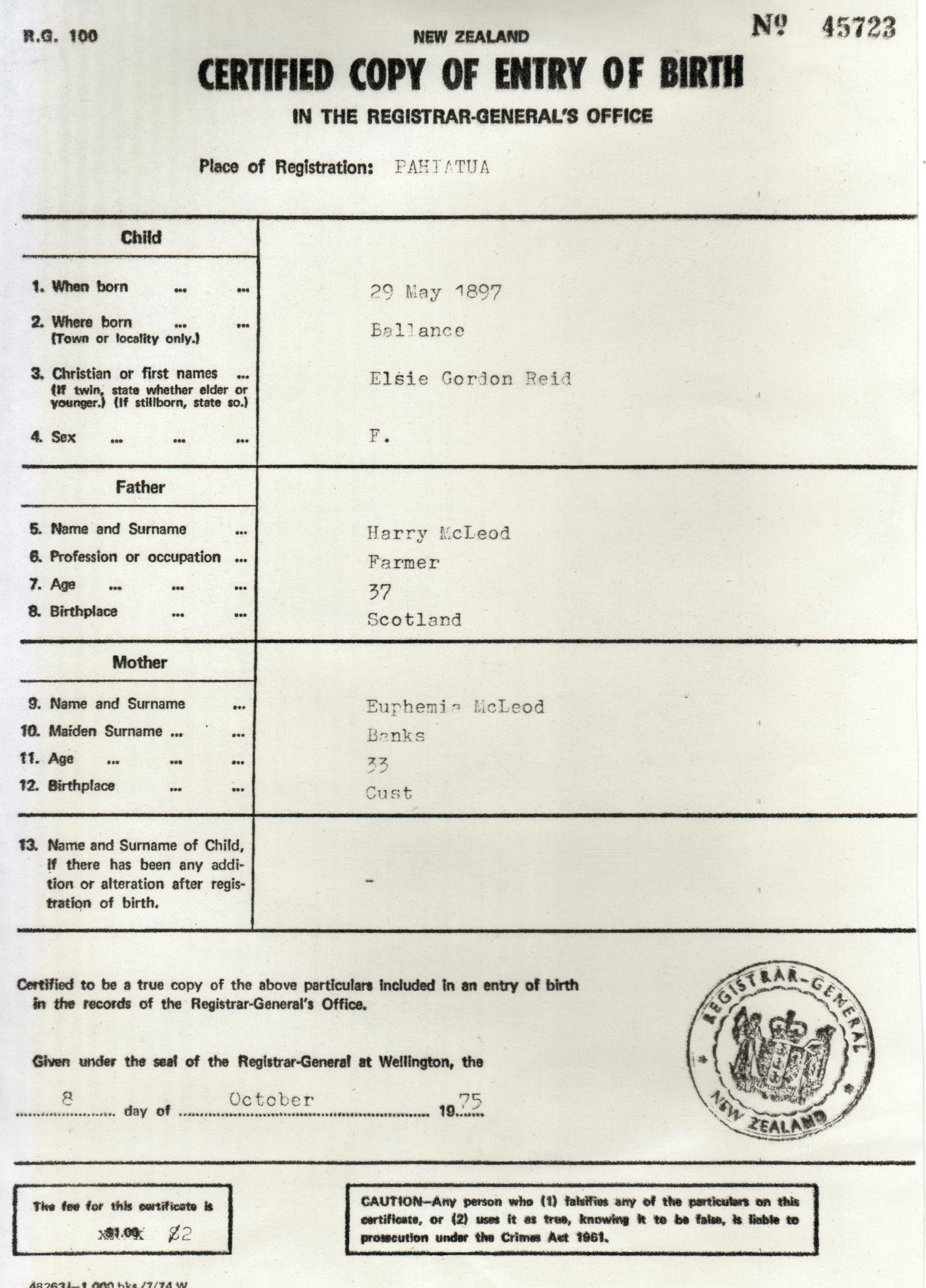 29 May 1897 - Ballance, Wairarapa, NZ (cert)
