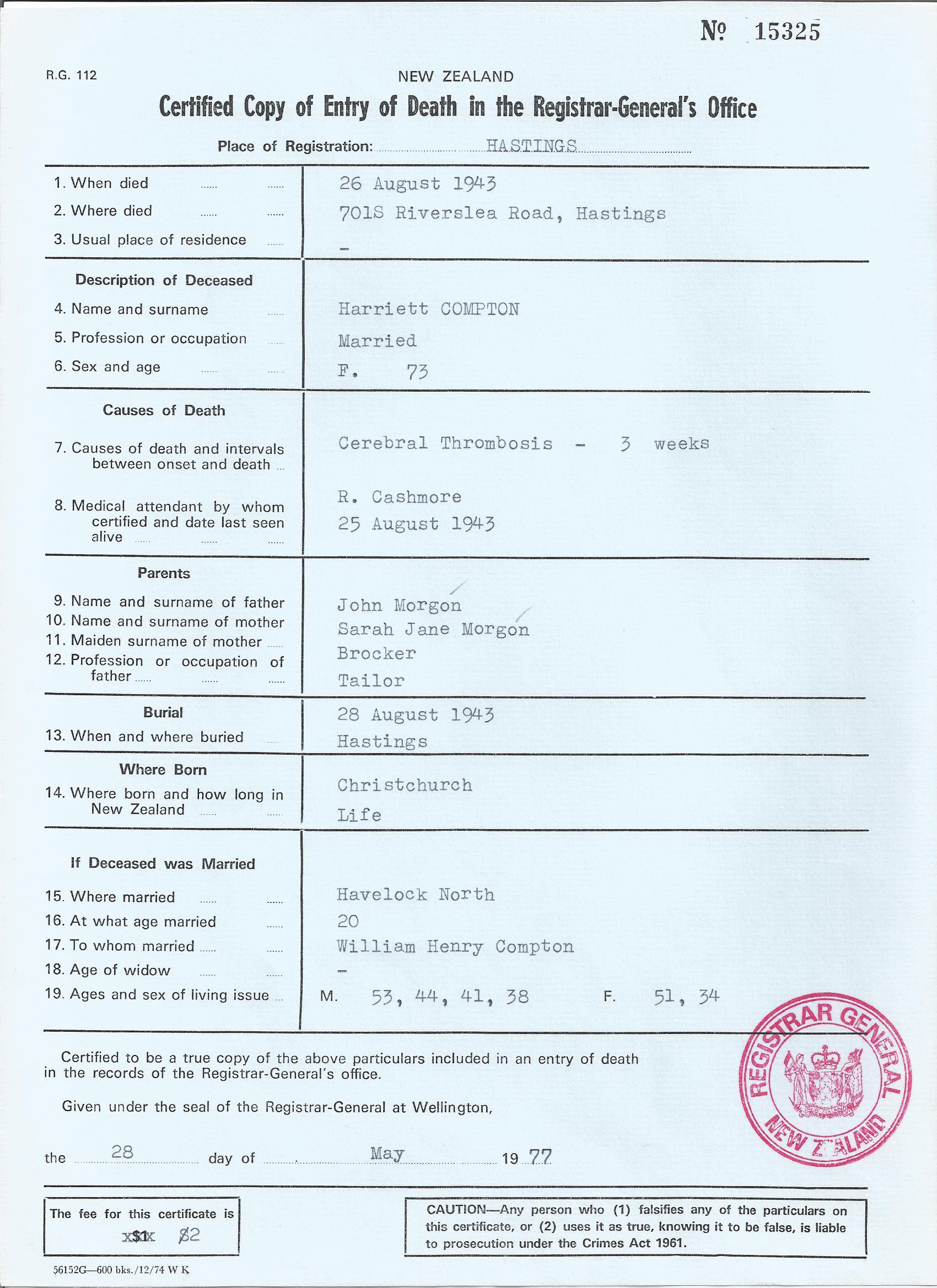26 August 1943 - Hastings, NZ (cert)