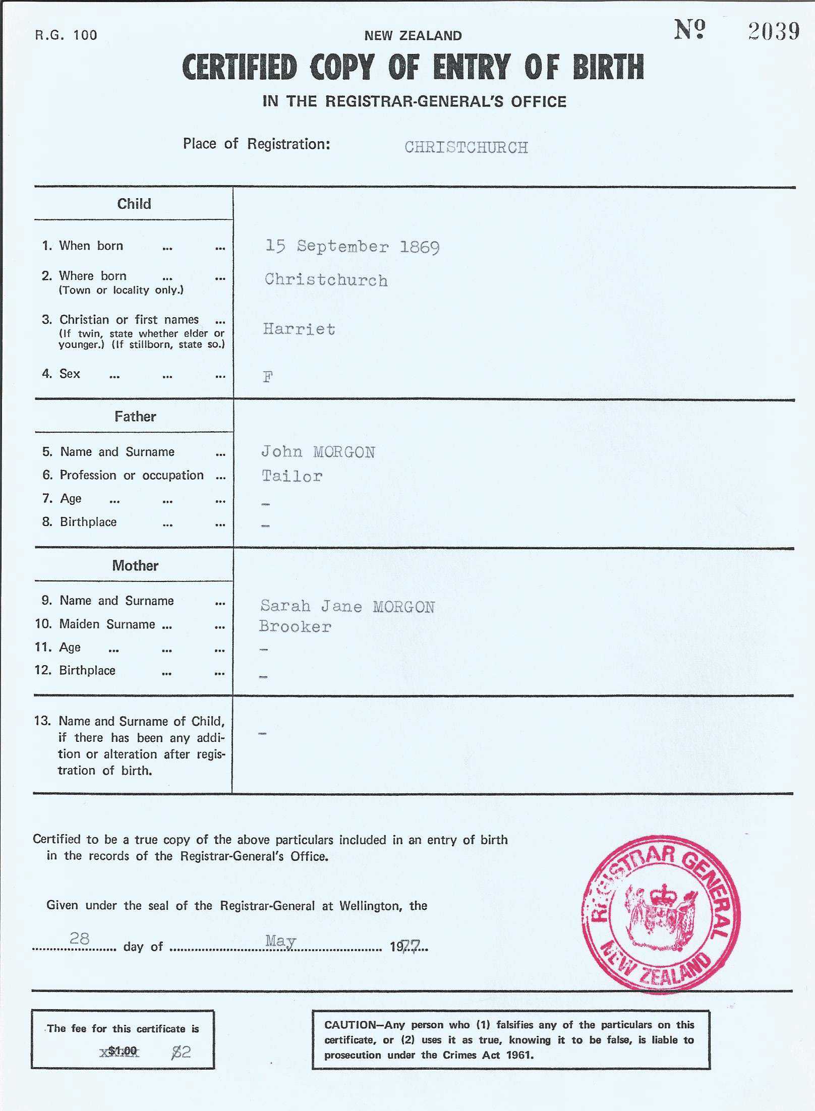 15 September 1869 - Christchurch, NZ (cert)