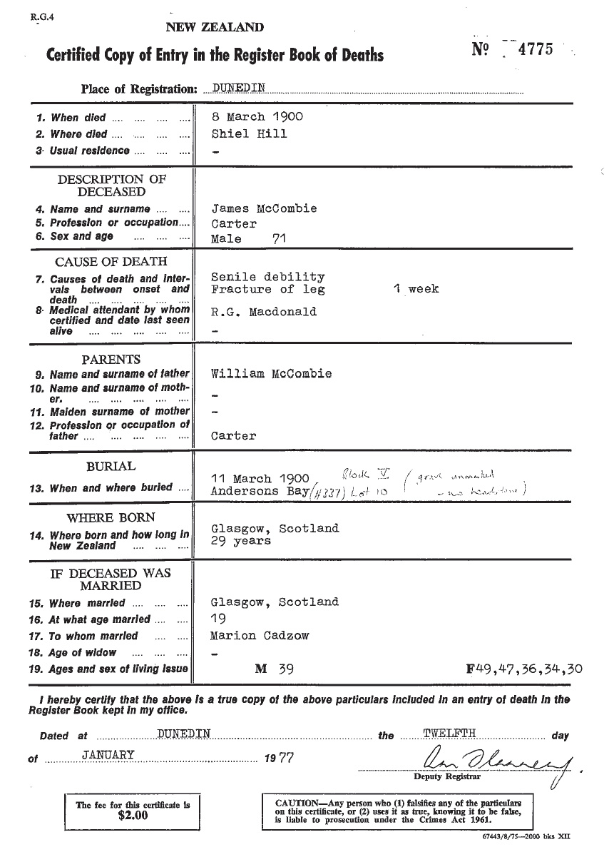 Buried in Dunedin's Andersons Bay - block 5, plot 10 (no headstone) (GPS: -45.903237, 170.533309)