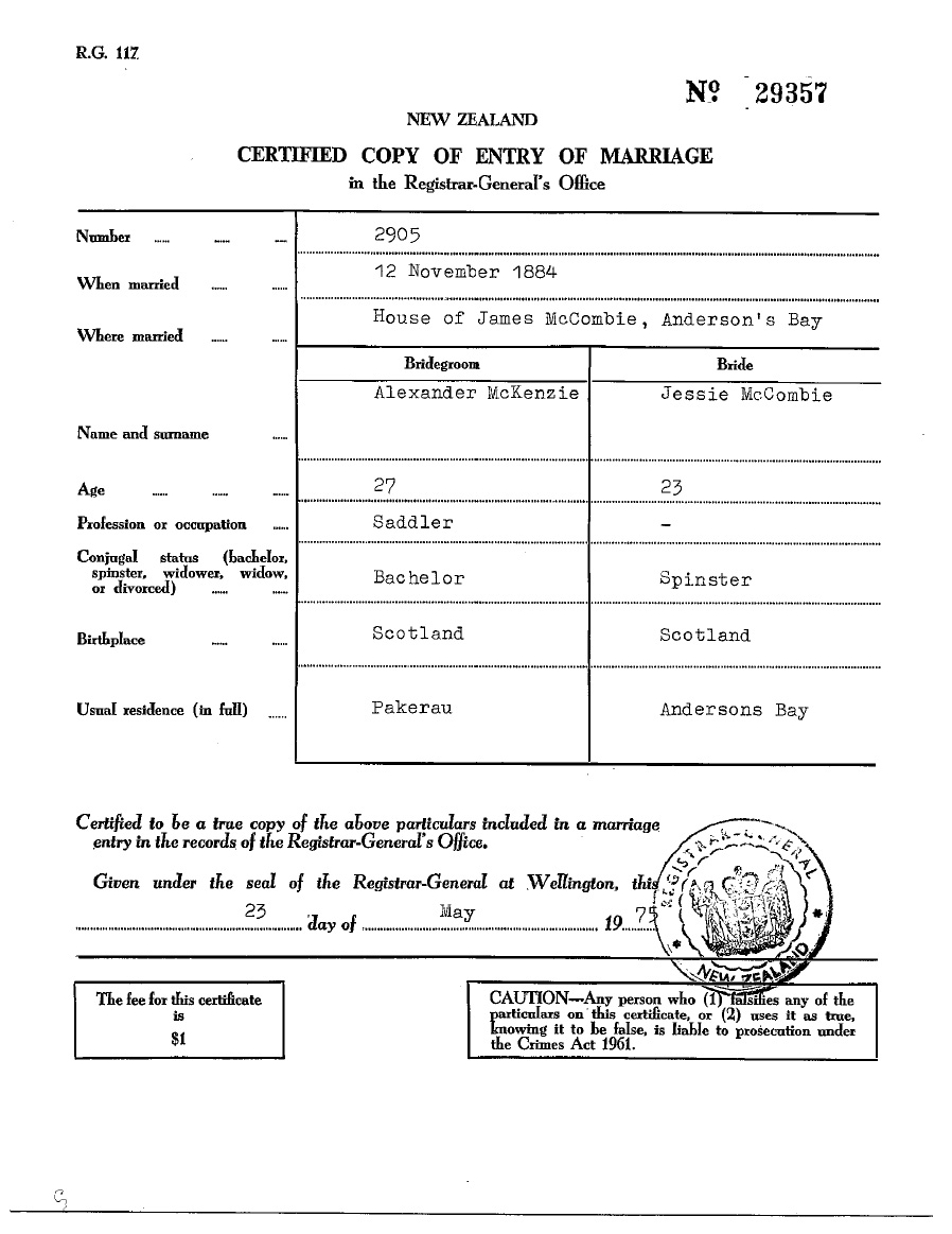 12 November 1884 - McCombie residence, Anderson's Bay, Dunedin, NZ