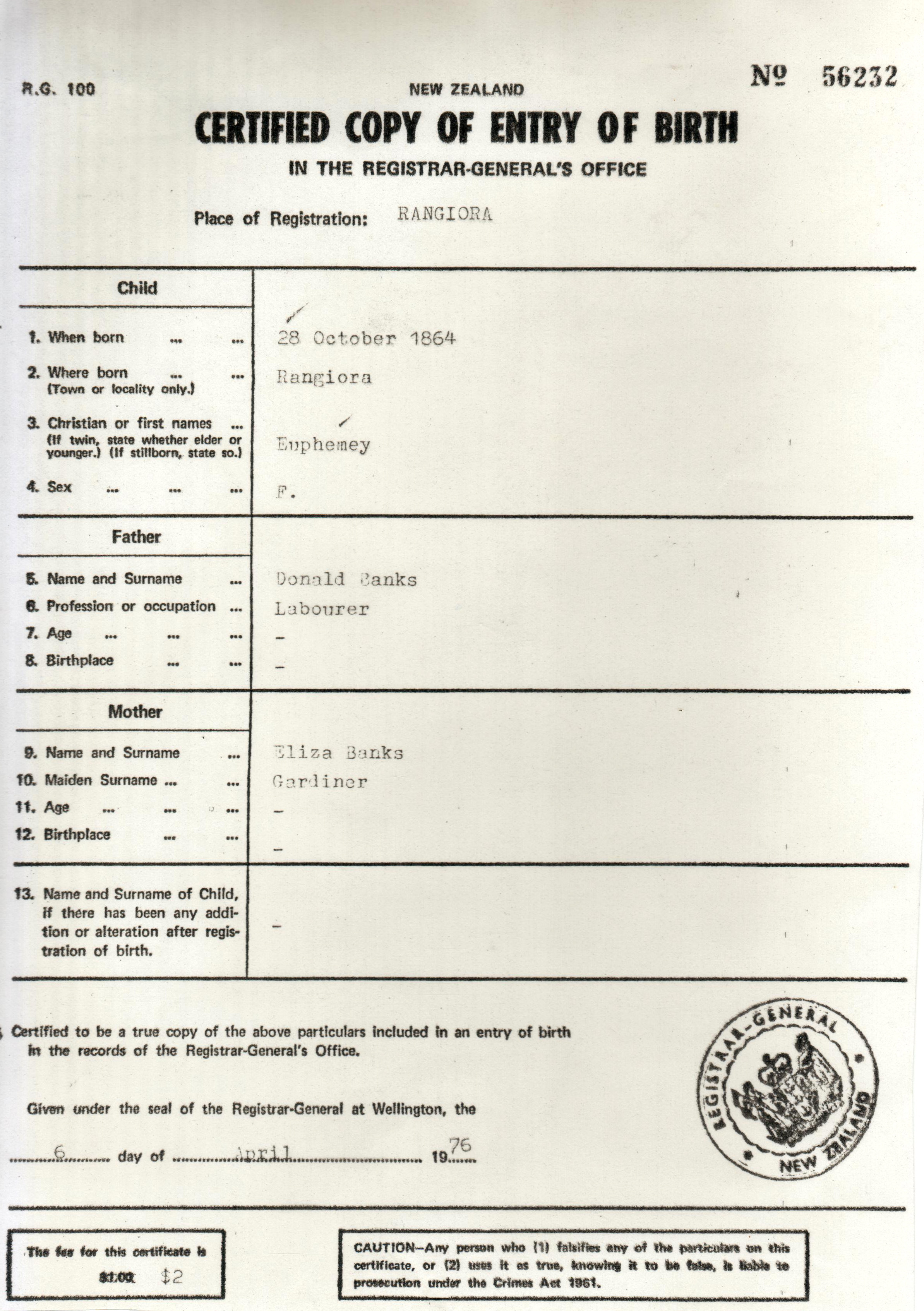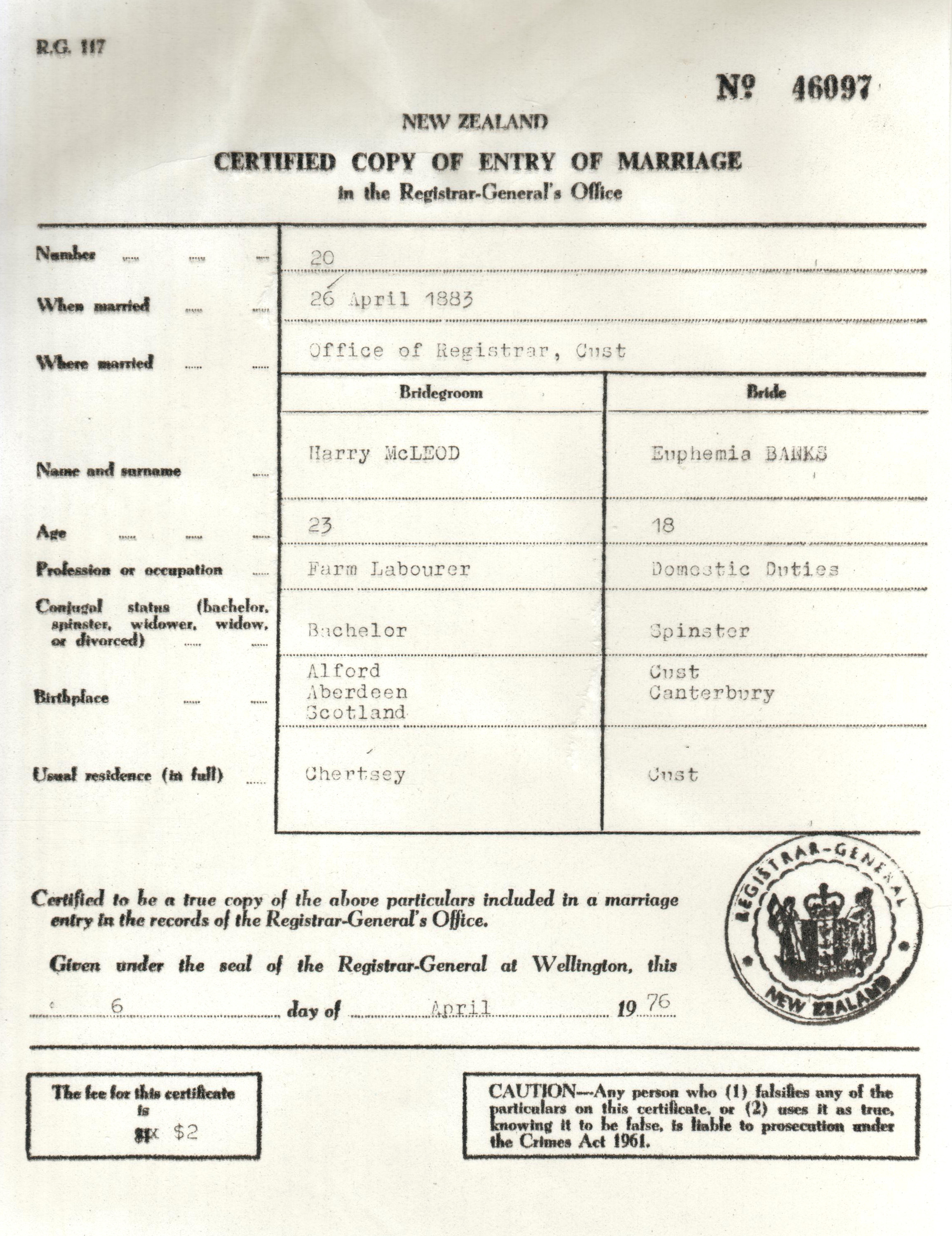 26 April 1883 - Cust, Canterbury, NZ (cert)