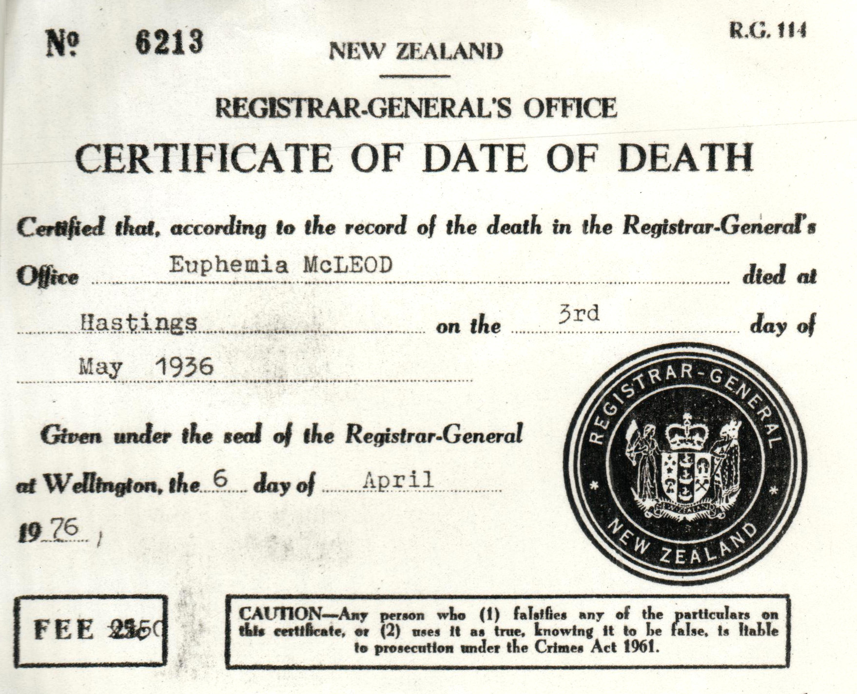 3 May 1936 - Hastings, NZ (short cert)