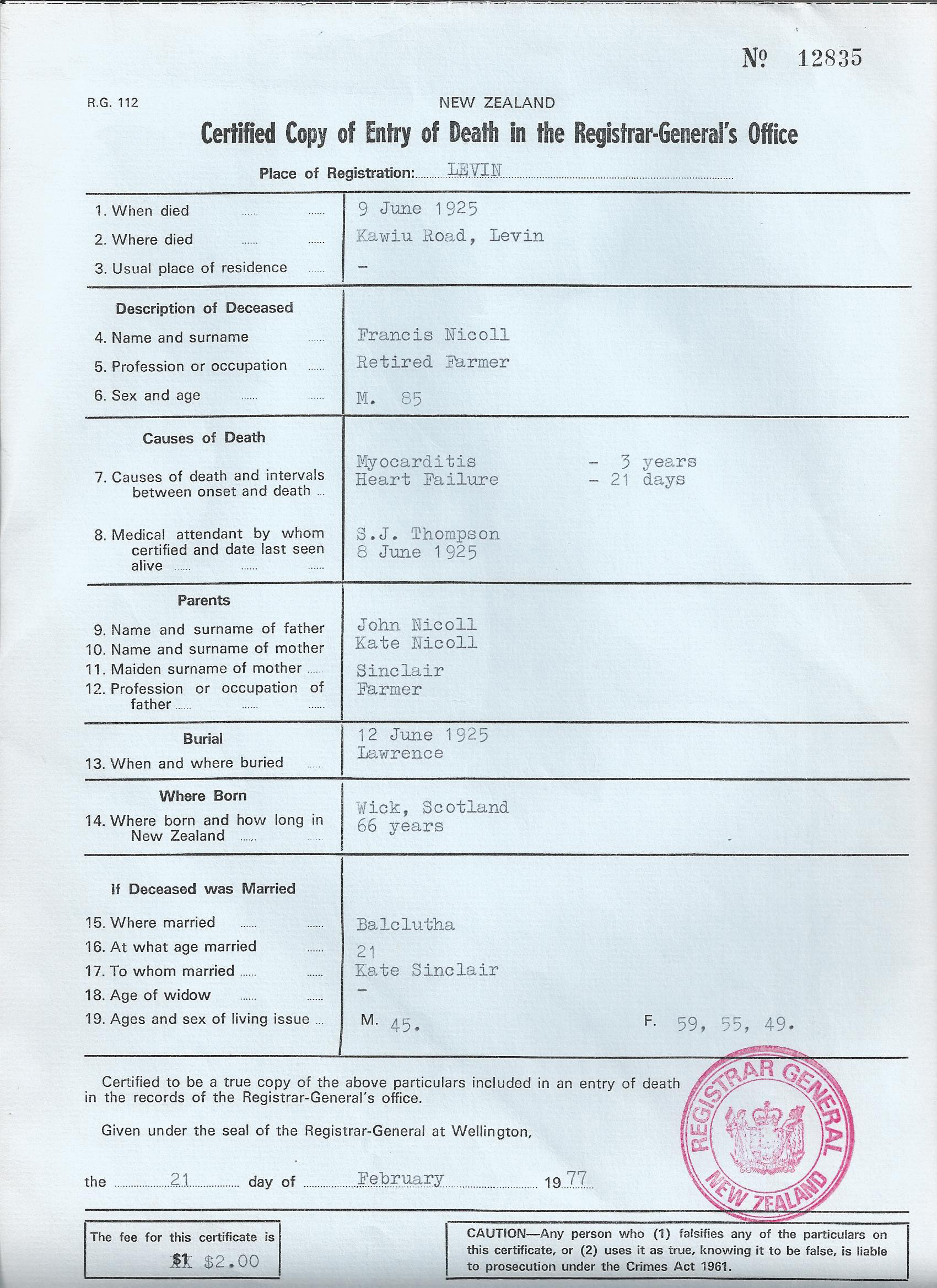 9 June 1925 - Levin, NZ (cert)