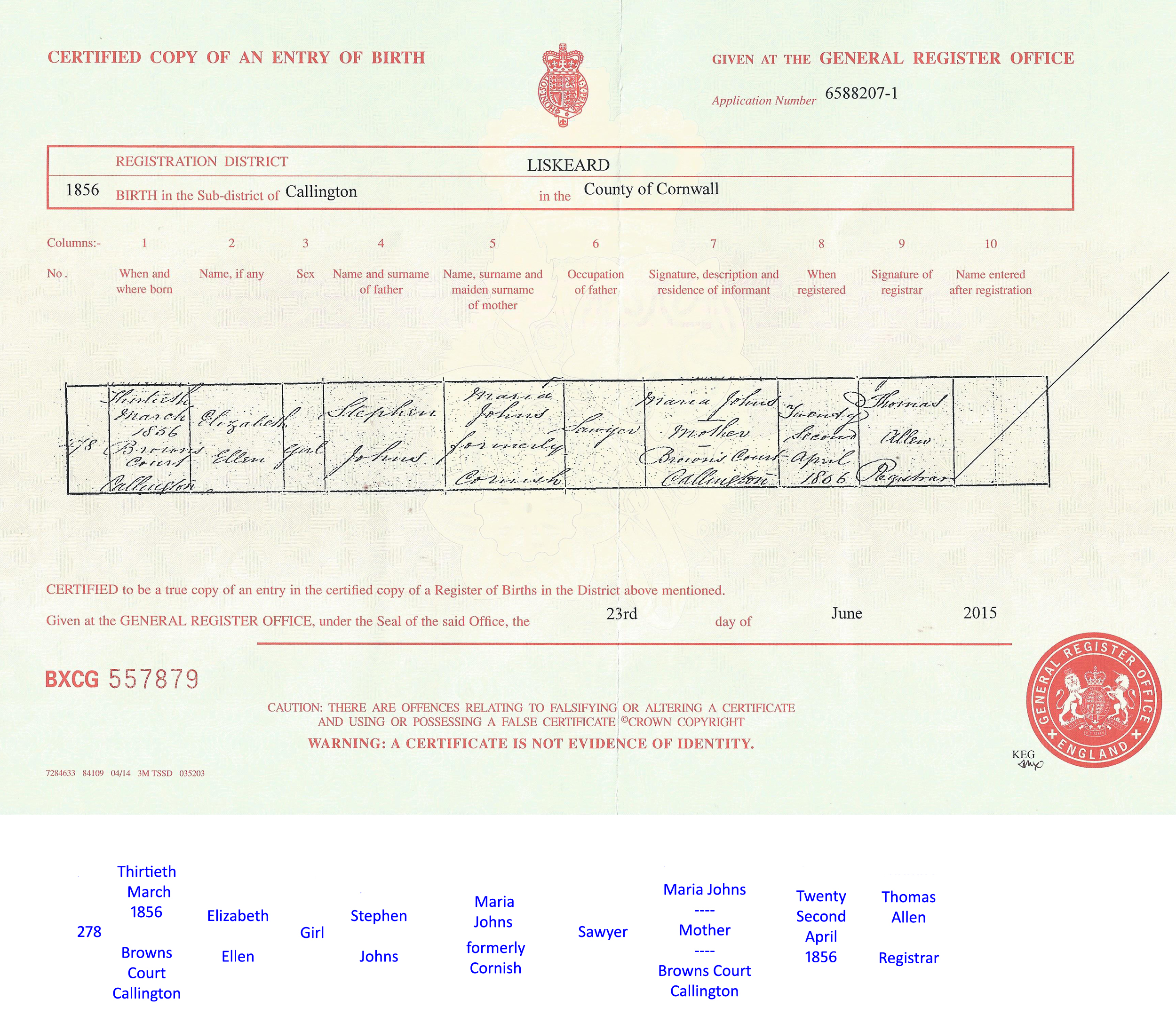 30 March 1856 - Callington, Cornwall, UK