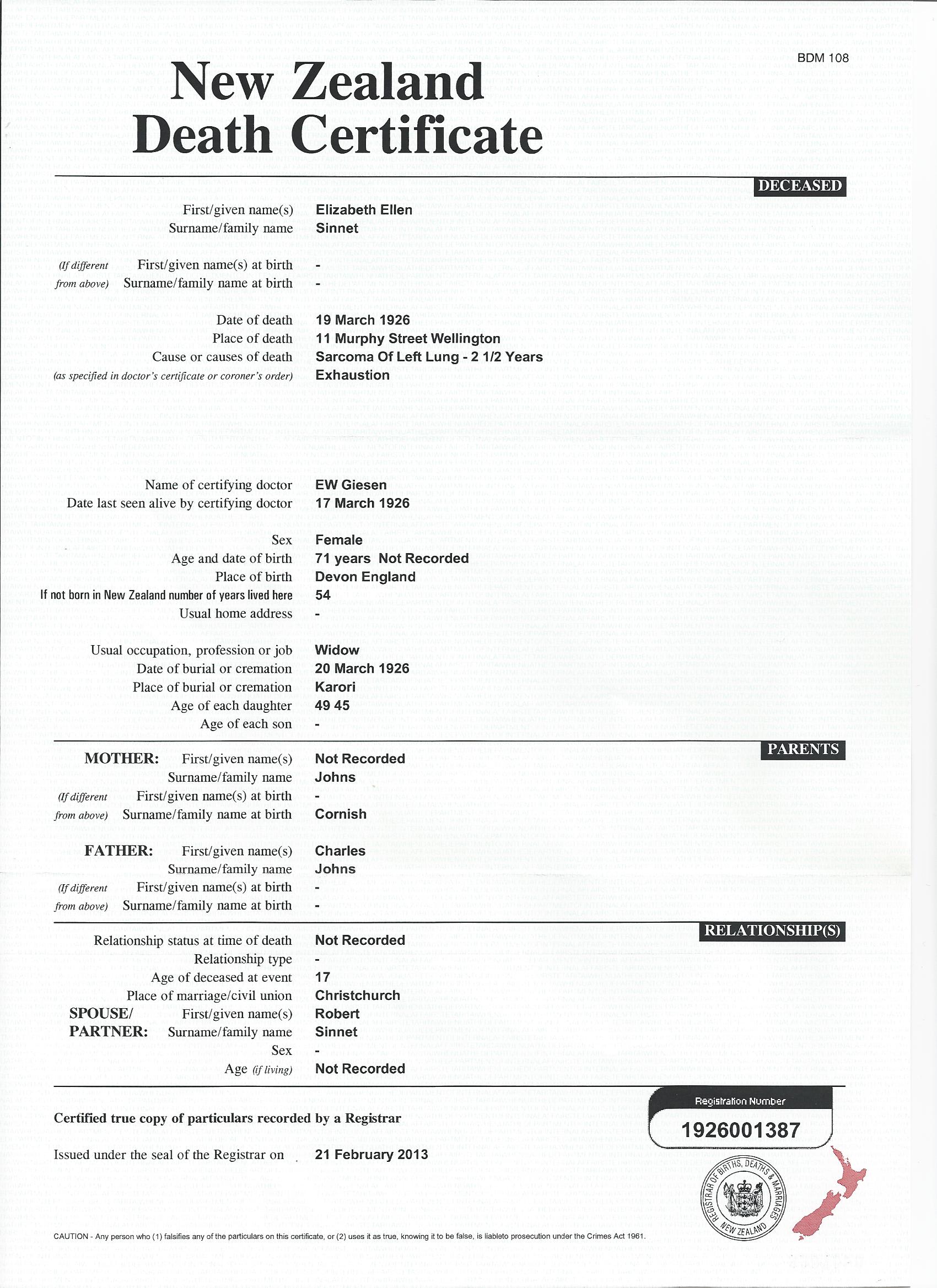 19 March 1926 - Wellington, NZ (cert)