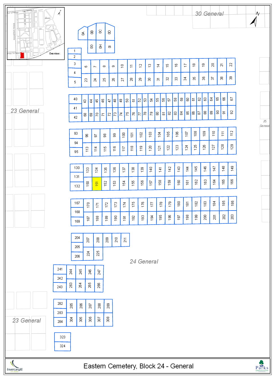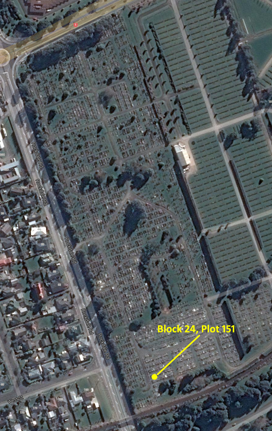 Buried in Invercargill's Eastern Cemetery - block 24, plot 151 (GPS: -46.203088, 168.127215)