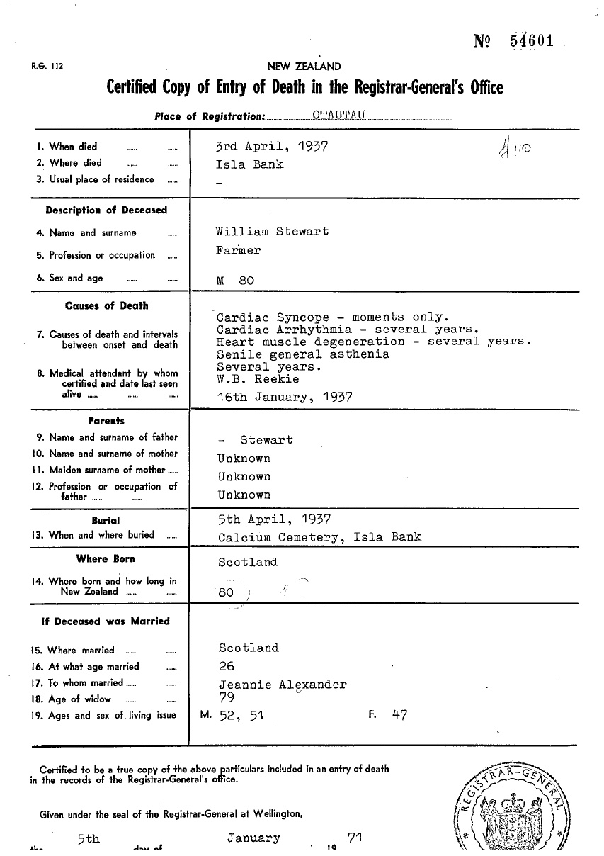 Buried in Isla Bank's Calcium Cemetery - block B, plot 224/226 (GPS: -46.203145, 168.127178)